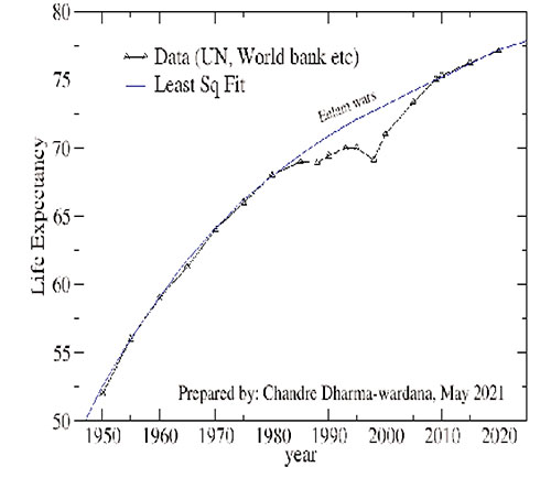 In a very recent U-tube emission Dr. Padeniya of the GMOA claims that since 1960, Sri Lankans have been EATING POISON IN THEIR FOOD. Mr. Mendis also seems to think so, and want people to eat only organic food. But the attached graph shows that the life expectancy in Sri Lanka has steadily increased, except during the Eelam wars.