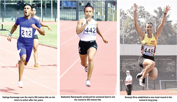 Sprinters Nadeesha Ramanayake and Kalinga Kumarage and long jumper Sarangi Silva commenced from where they left exactly a year ago as they produced outstanding feats on day one of the 98th National Athletics Championship at the Sugathadasa Stadium on Saturday.
