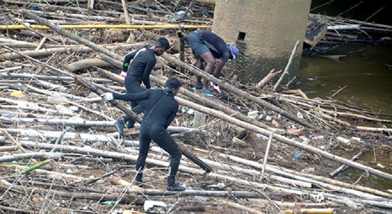A team of Navy divers and personnel attached to the Rapid Action Boat Squadron of the Southern Naval Command cleared blockages under the Dodangoda and Agaliya bridges over the Gin River in Baddegama area of Galle, on Friday (03)