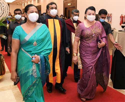 Former First Lady Shiranthi Rajapaksa and Health Minister Pavitra Wanniarachchi arriving at the BMICH for the recent installation of Dr. Pradeep de Silva as the President of the Sri Lanka College of Obstetricians and Gynecologists (pic courtesy Health Ministry)