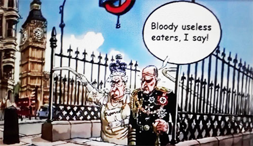 A cartoon of the Royal Couple that appeared in a British tabloid displaying with the Queen carrying a book titled ‘Eugenics’ and a remark made by the Prince.